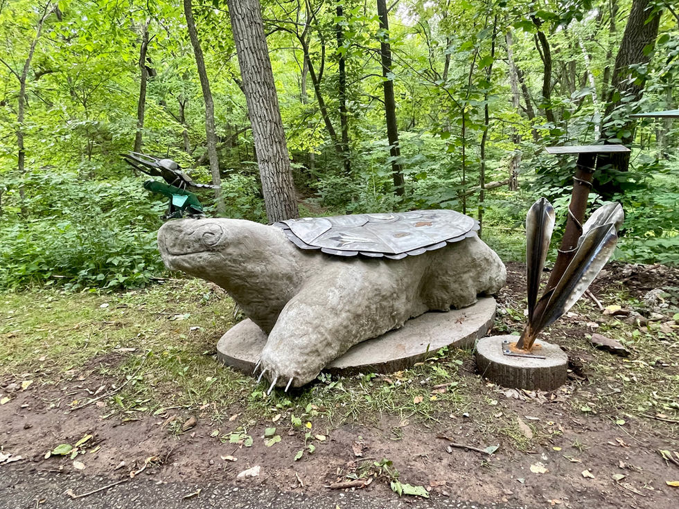 Earth Grasper. Commissioned by the Baird Creek Preservation Foundation. It consists of a gigantic common snapping turtle made of concrete, with a stainless steel green tree frog and stainless steel crayfish fabricated from cutlery sitting on its head. The stainless steel shell depicts the Oneida 13 Moon Calendar. In the Iroquois Creation story, the Earth was created on the back of a turtle. It was there that life began to grow. The turtle clan represents the shifting of the earth and the cycles of the moon. This calendar is a natural anomaly given to the native people of Turtle Island to remind them of their connection to Mother Earth and that we are not only connected as one people, but we are connected to the natural forces of above and below. An honor to present this during the week of the celebration of Oneidas bicentennial celebration. Yawʌʔkó.
